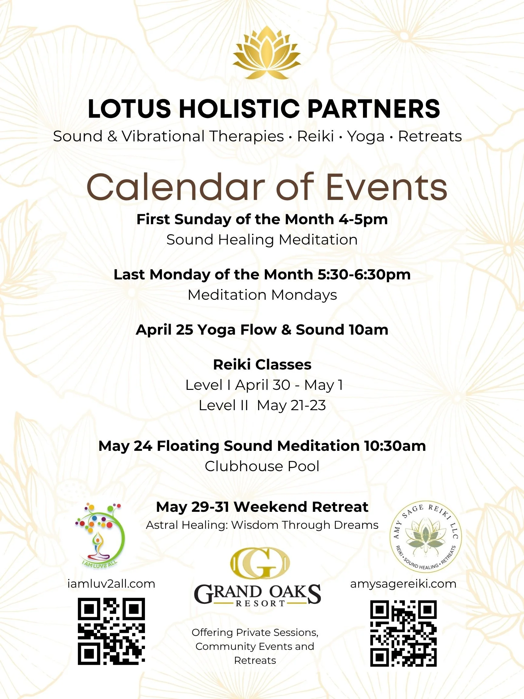 Accepting clients in Central Florida. Please contact me directly to schedule your private session, group event, Reiki certification or medical professional presentation. I look forward to working with you! Please continue to scroll down for a complete list of offerings, upcoming events and retreats with Lotus Holistic Partners and private sessions with me at Grand Oaks Resort in Weirsdale, Florida.